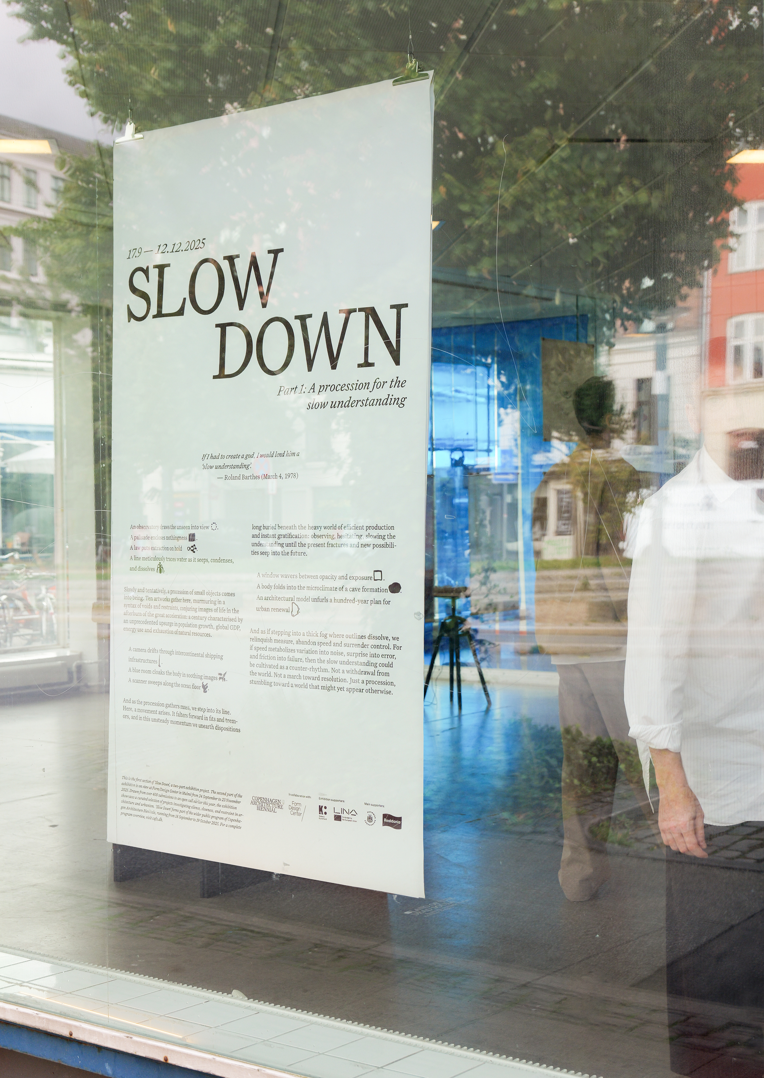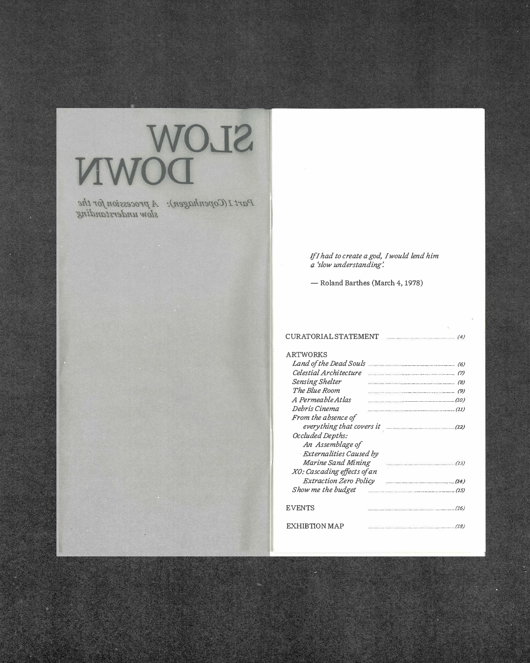 Exhibition identity and book design for Slow Down, a two-part exhibition organized by Form/Design Center and Copenhagen Architecture Festival (CAFx). The first part is presented in Copenhagen and the second at Form/Design Center in Malmö, where 24 creators showcase works exploring what happens when we slow down and open up to new ways of understanding, building, and living.